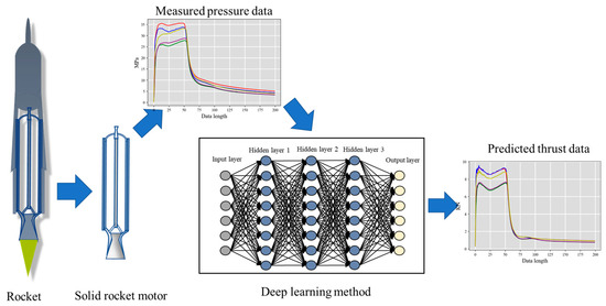 The primary objective of this study is to collect pressure and thrust data from ground experiments of SRMs using sensors and preprocess the obtained data into training and test sets. Subsequently, the collected data will be utilized to develop a predictive model for thrust data, utilizing deep learning techniques. The data processing phase will comprise several essential steps, including filtering, normalization, and feature extraction. The deep learning models will be trained using a training set, and their performance will be evaluated using a test set. The optimal parameters of the model will be determined using experimental comparison methods, and the model’s performance will be assessed using metrics such as mean squared error and mean absolute error. The process is illustrated in Figure 1.