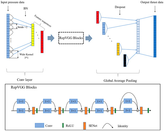 This section primarily focuses on the system composition and thrust data prediction process of the lightweight one-dimensional RepVGG network. The training process predominantly employs the convolution module within the model to conduct convolution operations on the motor parameter data, thereby capturing data features. The network model’s composition primarily comprises one-dimensional convolution, RepVGG block [37], and dropout [38]. Among these components, the RepVGG block finds extensive usage in image processing. However, due to the distinct patterns of motor parameter data compared to images, adaptive modifications are made to the RepVGG block. The dimension and step size of the convolution kernel within the RepVGG block are adjusted to enhance its suitability for motor parameter data.