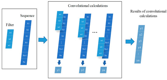 The input sequence data entered are , and n represents the length of the X sequence. In convolution operations, the length and number of filters can be defined. For example, the filter length in Figure 3 is 3, the number is 1, and the sequence convolution operation is performed. The calculation formula is as follows: