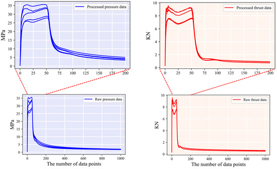 During solid motor testing, the thrust magnitude rises rapidly from zero during the ignition process [41]. The thrust of the entire process can be divided into primary thrust and secondary thrust [42,43]. Secondary thrust is primarily used for aircraft cruising, and the thrust magnitude is generally stable. To facilitate the training and testing of subsequent deep learning models, the thrust data and effective working section of the pressure data are intercepted to prepare samples. Given the high accuracy of pressure data in current measurements, this study utilizes combustion chamber pressure data for end-to-end prediction of thrust data. Based on data analysis and motor operating time, the first 200 points of the entire process are used to prepare samples. Data cropping is shown in Figure 5.