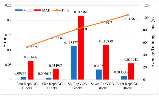 The size of the filter and the number of blocks also have an effect on the prediction performance of the model, and we experimentally documented model errors when we tested them with different filter sizes and different numbers of blocks. Figure 12 shows that the training time increases linearly with the number of blocks, which increases the computational pressure. The model’s performance with more blocks on the test set differs. The reason may be that with the increase in the number of blocks, the training parameters of the model also increase, and the training set is a small data set, resulting in an easy overfitting [47]. As a result, models with more blocks on the test set perform poorly. In a comprehensive comparison, it is found that the model with five blocks has good performance, which is used as the predictive model of the lightweight RepVGG method.