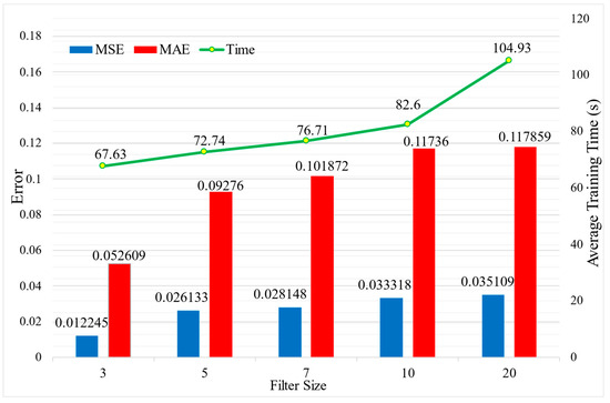 The lightweight RepVGG method investigates the impact of the convolutional filter size on network performance. An experimental method is employed to compare the effect of different filter sizes on test accuracy, and the model training time is also measured. Figure 13 illustrates that using a filter size of 3 results in the smallest MSE and MAE on the test, indicating that the model performs best with a filter size of 3. Additionally, the training time increases with larger filter sizes while prediction accuracy decreases. Smaller convolutional kernels can extract fine features, enabling the model to learn abstract features. Moreover, smaller kernels require fewer training parameters, reducing model complexity and accelerating training.
