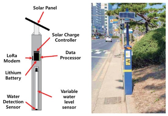 To explain the differentiation of the proposed technology in more detail, the urban flooding sensor currently in operation in the Republic of Korea [32] is shown as a conceptual diagram and an example of an actual installation site in Figure 2.