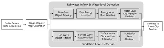 As mentioned in the previous section, complicated urban environments, including lowlands and underground facilities, involve frequent movements of humans, bicycles, and motor vehicles. Such objects are frequently detected by a radar sensor when utilized to monitor rainwater inflow; as these objects have strong reflectivity and high Doppler velocity, they can significantly hinder the accuracy of detecting the inflow of rainwater, which has relatively weaker reflectivity and Doppler velocity, or cause misdetection.