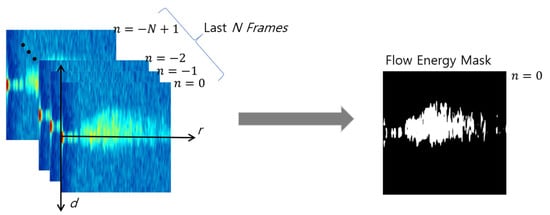 As proposed by Jang et al. [33], WAVE-Surf determines the presence of flow energy at a coordinate (r, d), provided all reflectivity values , at the same coordinate (r, d) on a range–Doppler map satisfy the reflectivity threshold for the latest N number of frames detected by the radar, to detect pure water flow in a complicated environment. Similarly, the flow energy mask M can be generated in the entire range of the Doppler map, and the mask value for each coordinate is defined in Equation (1).