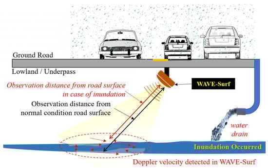 The proposed water level and velocity surveillance system for urban and road flooding (WAVE-Surf) is a subminiature low-power IoT technology based on an industrial radar sensor that can be easily installed in lowlands or underground facilities in cities. A schematic of the proposed technology and a simple example are presented in Figure 3.