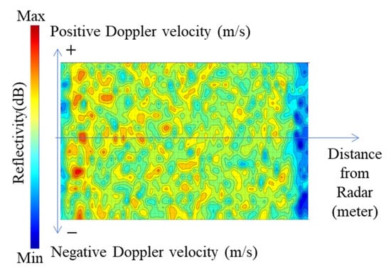 To detect rainwater inflow and flood levels in cities, WAVE-Surf is equipped with a frequency-modulated continuous wave (FMCW) radar sensor that utilizes a bandwidth of 77 GHz and is commonly utilized for short-distance movement detection, altimeters, and autonomous driving. First, the proposed method obtains the reflectivity and Doppler velocity with respect to the distance from the FMCW radar and subsequently generates a two-dimensional graph image through range–Doppler mapping. The utilization of graph images allows the connectivity between continuous or discrete Doppler velocities to be intuitively understood and the flow energy of rainwater to be easily separated from the surrounding objects. A representation and an example of a range–Doppler map are presented in Figure 5.