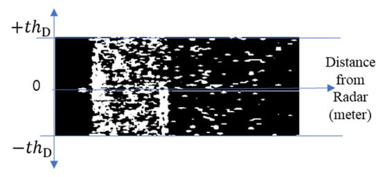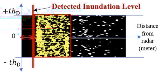 First, most scattering waves observed during flooding have a gentle waveform and a lower Doppler velocity than nearby objects. Therefore, coordinate values with a Doppler velocity lower than the threshold were extracted by utilizing the maximum threshold of the Doppler velocity for all reflectivity values present at the coordinate (r, d) in Equation (5) on the range–Doppler map in Figure 10.