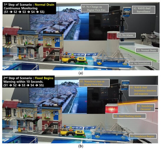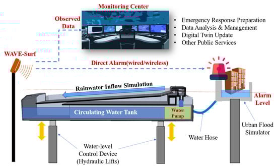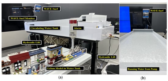 Furthermore, a city model was fabricated in a separate water tank at an appropriate height and connected to the circulating water tank through a hose; thus, flooding was simulated as water flowed into the city model when the circulating water tank rose above a certain height, . WAVE-Surf monitored the circulating water tank, which was considered an urban lowland, and immediately operated an emergency alarm device when the height of the circulating water tank exceeded (urban flood risk height) according to the previous setting. The actual experimental environment, configured based on the conceptual diagram in Figure 13, is presented in Figure 14. The actual water flow is presented in Figure 14b.
