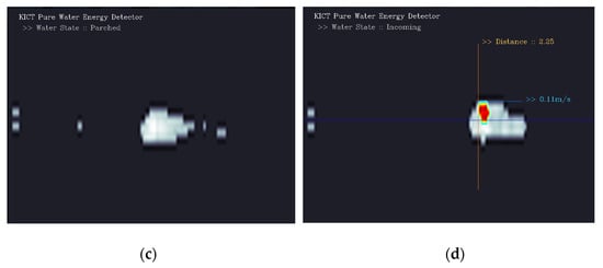 Figure 15 shows the operating status from the time flooding begins at a specific distance to the time it takes for WAVE-Surf to detect flooding. From the proposed algorithm, the buffering frame N for object filtering and pure flow energy detection was set to N = 5, and WAVE-Surf was set to operate at 1 fps. Figure 15a–d show the pure flow energy detection results 0 s, 1 s, 3 s, and 4 s after the start of flooding, respectively. When the flooding simulation device is not operated, that is, when no flow occurs, the results of WAVE-Surf always show the results shown in Figure 15a. When the flooding simulation device is not operated, that is, when no flow occurs, the results of WAVE-Surf always show the results shown in Figure 15a. From the experimental result in Figure 15d, it is confirmed that flooding was detected exactly 5 s after the flow occurred. Additionally, the areas expressed in achromatic colors in Figure 15 mean that obstacles at that distance were recognized. On the contrary, the area where pure flow energy is detected is expressed in chromatic colors, and only then can it be confirmed that the flow speed and distance are calculated and displayed.