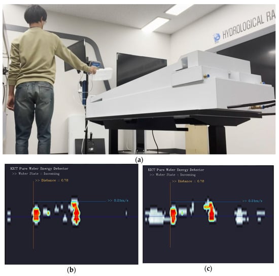 The range–Doppler map, represented in terms of the Doppler velocity distribution (y-axis) with respect to the radar reflectivity distance (x-axis), is presented in Figure 5a, where the reflectivity of an object detected by the radar in the radar reflectivity expression area is expressed on the map along with the Doppler velocity of the object. The range–Doppler map of an actual river surface observed during one frame from the radar is displayed in Figure 5b, where the blue color represents low reflectivity, and the red color represents high reflectivity. The reflectivity in this graph has a positive Doppler velocity in most distant areas because the flow (by the positive Doppler velocity) toward the radar was detected over a long distance at a very close distance from the river surface. Rainwater inflow and flood level detection were performed using a range–Doppler map.