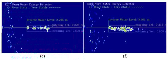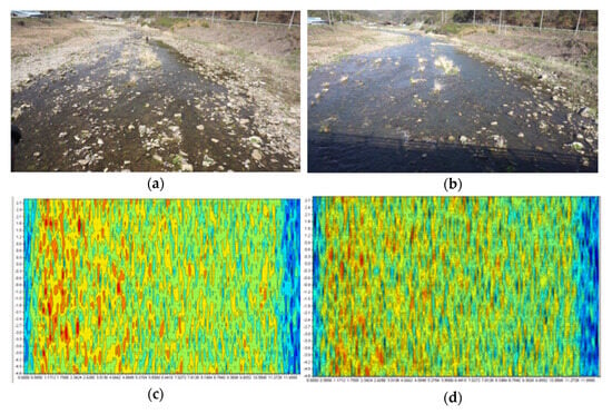 In fact, since it was difficult to change the actual river’s water level or velocity rapidly in a short period of time, the observation experiments were performed on a bridge that was relatively far from the river assuming that the river water levels were low, as shown in Figure 18a,b. Conversely, assuming a time when the river’s water level was rising, the experiments were conducted in places where the flow speed was fast and closed to the water surface such as the river’s underwater weir and under the embankment, as shown in Figure 18c,d.