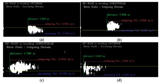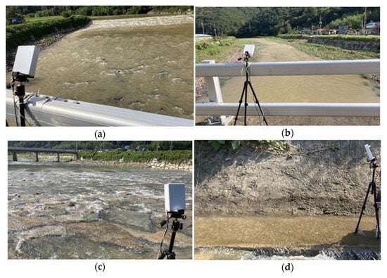 Figure 19c,d show the observation results obtained by installing WAVE-Surf in the downstream direction above the river’s underwater weir and in the upstream direction under the river embankment, respectively. From the results of Figure 19c,d, when tested under the river’s underwater weir and river embankment, the distances from the water surface were observed to be 1.78 m and 0.84 m, respectively. These results are clearly different from those obtained when tested on a bridge, showing that accurate observation results were obtained. Additionally, due to the influence of large drops caused by surrounding structures, the maximum observed flow velocities were 2.37 m/s and 2.40 m/s, respectively. From these results, the flow velocity was observed to be higher than that observed around the bridge, where the river width was wide and the slope was gentle, making it possible to trust the accuracy of the proposed technology.