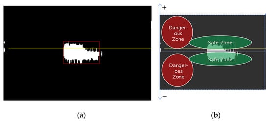 Finally, a flooding distance boundary can be obtained by performing blob labeling for bright regions, as in the previously explained flow energy detection, from the flood decision map, , as valid wave information. The flood information determined by the bounding box of the blob-labeled area in Figure 1 is presented in Figure 12.