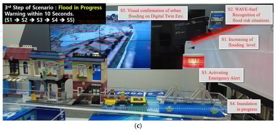 The results of simulating the steps of each scenario of the urban flood-monitoring system according to the water level and velocity observed by WAVE-Surf in real time are presented in Figure 23.