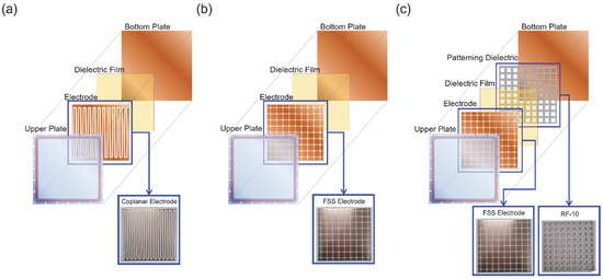 The DBD plasma generator, as depicted in Figure 1, utilizes an upper plate made of acrylic material measuring to isolate from the external environment. A square-shaped pit measuring is created on one side of the acrylic plate to establish a discharge region within. The electrode is inserted into the pit and is covered by a 70 polyimide dielectric film. The electrode attached to the upper plate is connected to a wire passing through the acrylic, and it is bonded to the acrylic plate using a sealing bond (940LE, SANUL CO., LTD, Seoul, Republic of Korea). The upper plate is then combined with the bottom plate, and the internal gas conditions are isolated from the external gas conditions by the presence of dual silicon O-rings in the side. Various types of electrodes are adopted for the characterization of plasmas. Each electrode type has already been proved to show an RCS reduction effect. Figure 1a shows a coplanar electrode (COP) using the same structure [14] and (b) shows a frequency selective surface (FSS) electrode, as conducted in experiments by Y.S. Lee et al. [15]. Therefore, in cases (a) and (b), the plasma is discharged between the polyimide dielectric barrier and the bottom plate. In case (c), a patterned dielectric is added. The introduction of patterned dielectric material can lead to an increase in the real part of the effective permittivity between the electrodes, potentially enhancing the attenuation effect [16]. In this case, plasma is generated between the polyimide film and the patterned dielectric (FSS + Patterning).