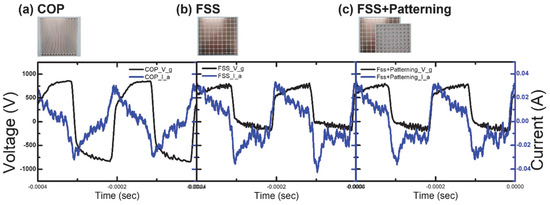 The voltage–current results obtained from the three DBD sources are presented in Figure 5. Voltage data are collected within 1 min after the initiation of the discharge, and the measurements are repeated 5 times to ensure accuracy. In Figure 5, and represent the voltage across the plasma resistance and the current flowing through from the measured data, respectively. Notably, the current results exhibit similarities in the observed trends of effective DBD discharge under the same square-wave generator power conditions [13,28]. Overall, the trends observed in the FSS and FSS + Patterning configurations are similar, while the Coplanar configuration shows slightly different results. The patterned dielectric does not affect the voltage–current shape and the difference can be attributed to variations in the electrode’s shape as the dielectric thickness remains the same. FSS-based structures have slightly biased and noisy voltage profiles. This shows that the shape of electrodes directly affects the circuit characteristics and plasma operations even in the similar structures. Additionally, a notable divergence is observed between the applied voltage and the voltage across the electrodes. This phenomenon is consistent with experiments exhibiting DBD characteristics in other instances, but the underlying cause remains elusive [13,15].