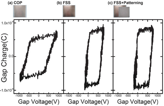 For the detailed analysis, Lissajous figures of the three types of DBD source with different electrode configurations are derived as in Figure 6. The area under the Q-V graph represents the energy consumed during one cycle [20]. All configurations display a trapezoid. Similar to the voltage–current data in Figure 5, the shape of the Q-V graph of the FSS and FSS + Patterning configurations are similar, while that of the Coplanar configuration shows some differences. In the case of FSS and FSS + Patterning, despite having lower applied voltages compared to the coplanar electrode structure, it can be observed that they possess higher charge values. Having a greater charge when the same voltage is applied signifies a larger capacitance. This observation can be explained by the FSS electrode and the FSS + Patterning electrode having a larger electrode area compared to the Coplanar structure or conventional DBD plasma sources, resulting in a greater capacitance.