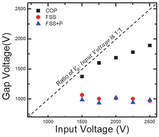 A plot of the ratio of the gap voltage to the input voltage. The black square dots represent the case of a coplanar structure, the red circles represent the form of FSS electrodes, and the blue triangles represent the case where patterned dielectrics are added.
