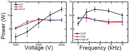 From Lissajous figures, the power consumptions of each type of the source are derived. Figure 8 shows the power consumption depending on input voltage and frequency, respectively. Again, the Coplanar structure shows different behaviors comparing to the cases of the FSS and FSS + Patterning structures. In the case of the Coplanar configuration, the power consumption continues to increase with voltage. On the other hand, the FSS and FSS + Patterning structures exhibit a slight increase in power consumption up to 2000 V, after which it remains relatively constant. Additionally, the variations with driving frequency show that the Coplanar configuration reaches its maximum power consumption at 5 kHz. However, the FSS and FSS + Patterning structures exhibit a slight decrease in power consumption on input frequency. Overall, the Coplanar structure shows higher plasma activation rate in the higher voltage and frequency range compared to FSS-based structures. Also, FSS-based structures show almost constant behaviors on input parameters. These results indicate that the optimal points in power and frequency vary depending on the electrode spacing and shape.