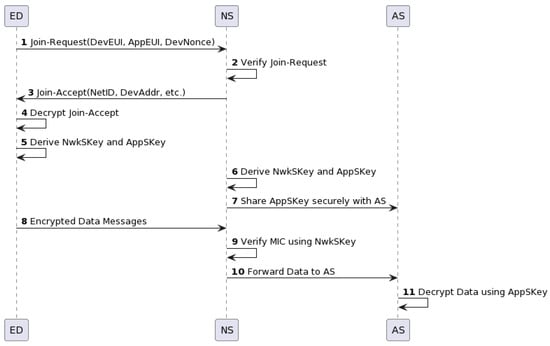 Figure 2 illustrates the OTAA process in LoRaWAN version 1.0. As shown in the diagram, ED initiates the process by sending a Join-Request to NS. This request includes the DevEUI (a unique identifier for the device), the AppEUI (application identifier), and the DevNonce (a device nonce to ensure request freshness). NS then verifies the request using the AppKey, a pre-shared key between ED and NS.