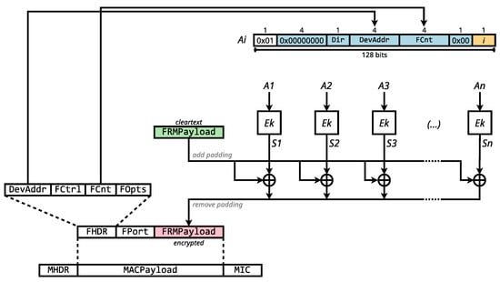 As illustrated in Figure 3, AES-CCM* operates by constructing a sequence of blocks, , centered around a unique nonce and a counter i. This nonce is generated using message header fields like DevAddr and FCnt. Each block is encrypted with the AES cipher to yield , which is subsequently XORed with its corresponding plaintext block to produce the ciphertext. If the plaintext’s length is not a multiple of 128 bits, zero-padding is applied.