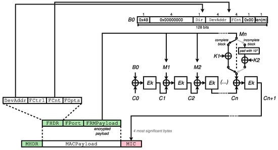 As illustrated in Figure 4, the message is composed of the MHDR, FHDR, FPort, and FRMPayload fields. and are subkeys generated from the session key to be used. CBC is applied using an initial value of , first to the special block , then on each block from the message. The last block of the message is either XORed with or padded, then XORed with prior to being processed, depending on being a complete block, that is having a size of exactly 128 bits, or not. Note that 10* in the figure denotes padding with a leading bit equal to 1 followed by the required number of 0, as prescribed by the AES-CMAC specification.