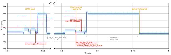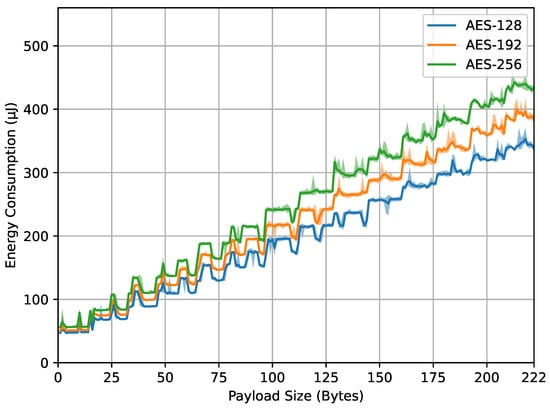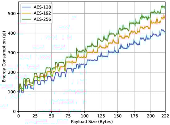 Furthermore, for a payload size of 222 bytes, when comparing AES-256 to AES-128, the increased computation time is 750 microseconds and the increased energy consumption is 236 microjoules. Notably, there is a direct correlation between the results of energy consumption and computation time. Even though these increases in energy and time seem significant, it is interesting to put them in perspective and compare them to a major cause for energy consumption on the ED, namely the actual radio communications. As we calculated in Section 3.7, the time on air of a frame carrying a payload of 222 bytes, using SF7, a bandwidth of 125 , and a coding rate of 4/5, amounts to around , and we measured the energy spent by the ED during that period to around . These observations are summarized in Table 2 to highlight that, in terms of time on air costs, the increases represent just 0.2% and 0.13%, respectively. This emphasizes that the extra costs of using longer AES key sizes are small when compared with the main energy and time demands during time on air. Increasing the AES key size is, therefore, unlikely to significantly reduce the lifetime of end devices while enhancing the security of communications.