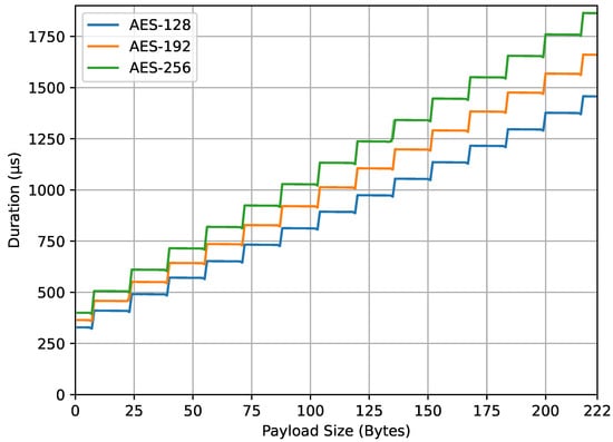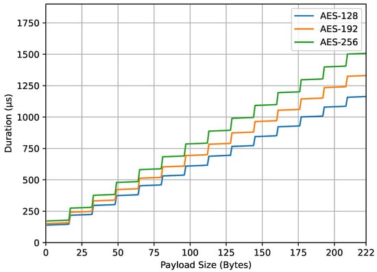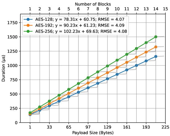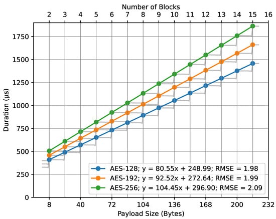 Figure 14 visualizes the increased computation time for the compute_mic() function under the influence of different AES key sizes. For AES-192-128, the duration increase is described by the equation , and, for AES-256-128, it is .