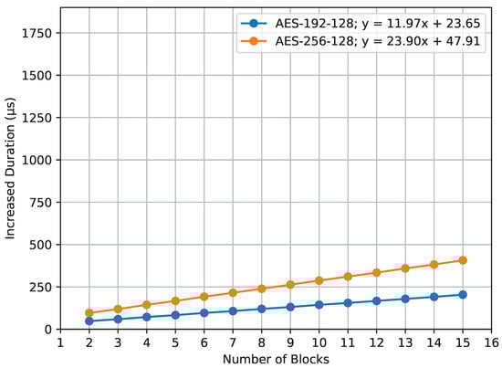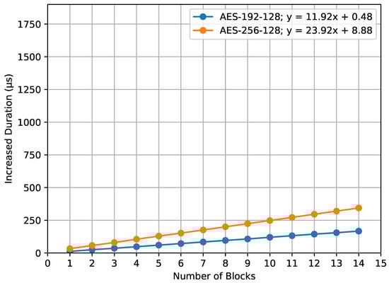 Figure 13 depicts the increased duration for the encrypt_payload() function with respect to varying AES key sizes. The graph portrays two distinct lines, representing the increase in computation time for AES-192 compared to AES-128 (denoted as AES-192-128) and for AES-256 compared to AES-128 (denoted as AES-256-128). The x-axis of the graph represents the number of blocks. Specifically, the equation for the AES-192-128 line is provided by , while the AES-256-128 line is represented by .