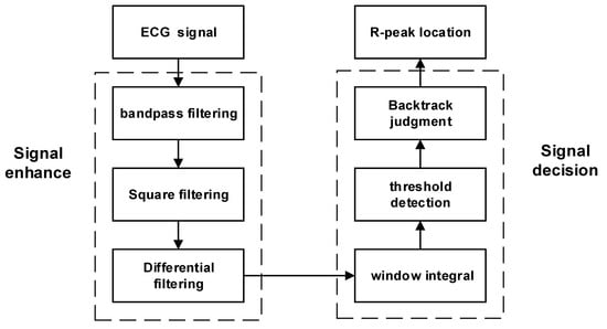 When analyzing ECG signals, the R peak is the most prominent feature and is relatively simple to identify. We applied the P-T algorithm and made some improvements on this basis to obtain R peaks of ECG signals. We adopted an adaptive QRS waveform detection algorithm using two thresholds to improve accuracy. By using the R peak as a reference, multiple signals can be segmented more accurately [28,29]. Figure 1 shows the steps involved in the algorithm process. First, the ECG signals are filtered and processed to improve the R waves. Then, a differential operation is performed on the filtered signals, which highlights the quickly changing part of the QRS complex. By using sliding integration, the position of the R peak is determined. To filter the peaks, two threshold conditions are set, where the second threshold is half the value of the first threshold. If a peak is higher than the first threshold, it is considered to be an R wave. If it is lower than the first threshold, it is classified as noise.