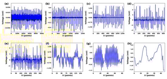 The ECG signal has an amplitude range of 10 uV to 4 mV, with the typical value being 1 mV. The frequency range spans from 0.05 to 100 Hz, and 90% of the QRS spectrum energy of ECG falls between 0.25 and 45 Hz [34]. Significant feature components are extracted by suppressing noise and unclear features. This paper uses the db4 wavelet basis with good correlation to the signal and perform 8-layer decomposition. Figure 3a–h represents the components from low frequency to high frequency at 0–100 Hz. The QRS frequency component is mainly included in Figure 3a–h. Frequency components within this range can improve the recognition performance of QRS wave frequency bands.