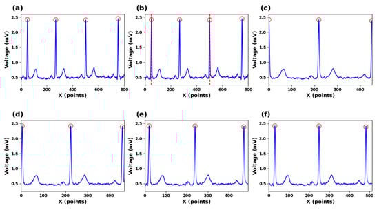 (a) ECG signals for R-peak detection. (b) Segmented ECG signals. (c) Zero-point expanded ECG signals. (d) Ten-points expanded ECG signals (e) Twenty-points expanded ECG signals (f) Thirty-points expanded ECG signals.
