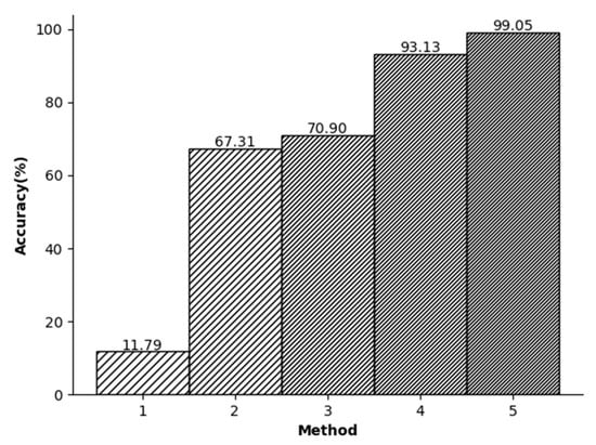 In this study, a series of experimental comparisons were conducted to evaluate the accuracy of ECG signal recognition. Figure 7 shows that when only the R-peak amplitude of the ECG signals was used for recognition, the accuracy was found to be relatively low. However, when the KSVD algorithm for sparse representation was employed, the accuracy increased significantly. Despite the utilization of random signal segments and the integration of wavelet transform and KSVD algorithm to compress the signals, the accuracy was still unsatisfactory. This limitation can be attributed to the selection of random segments. Randomly segmenting the signals without a reference point can lead to the randomness of the position of the signal components. In this case, the matrix components represented through sparse representation also exhibit randomness. This leads to lower accuracy. In the context of ECG signals, segments with the same length show diverse signal magnitudes, leading to relatively randomized distributions of their components. This randomness contributed to the challenge of achieving a sufficiently high recognition rate.