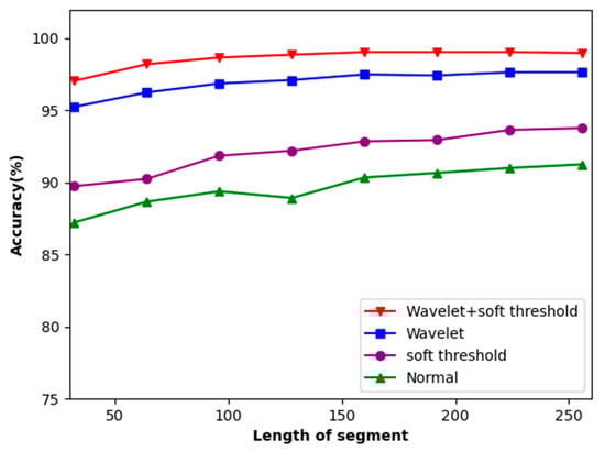 This method tackles the issue of noise in ECG signals. It identifies the original ECG signals and performs soft threshold denoising, followed by the wavelet transform. The signals before and after the addition of soft threshold denoising to wavelet transform are compared. As depicted in Figure 8, this method, combining both soft threshold denoising methods and the wavelet transform, achieved an 8% improvement in accuracy.