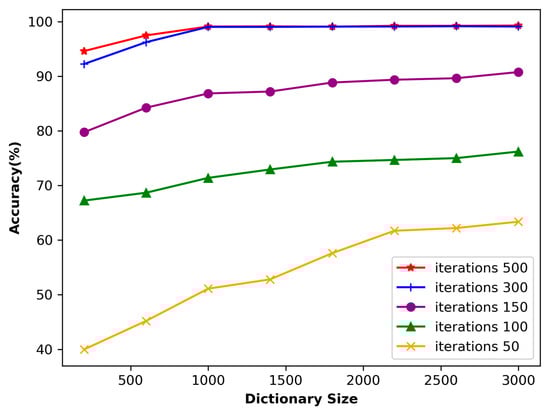 The number of input signal iterations has a significant impact on the learning ability of the dictionary. Figure 10 shows that when the number of iterations is only 50, the accuracy is relatively low despite the size of the dictionary. This is because the number of iterations is too small, which only allows the dictionary to capture a portion of the signal features, thereby affecting the learning result. As a result, using sparse representation to process input signals may lead to significant errors. However, as the number of iterations increases, the accuracy gradually improves. When the number of iterations reaches 300, the impact on accuracy gradually decreases. At this stage, it can be inferred that the dictionary is capable of effectively extracting most of the signal features.