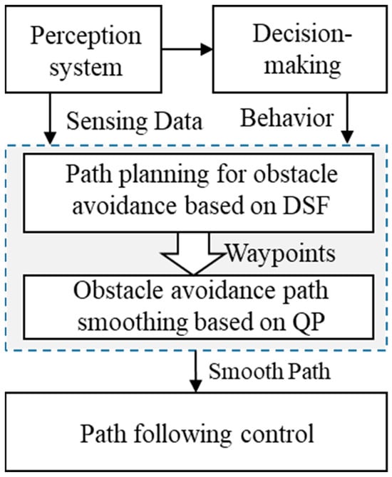In order to devise an obstacle avoidance path that ensures safety, smoothness, and compliance with the vehicle’s motion characteristics, this paper introduces a dynamic obstacle avoidance path-planning method with a two-layered structure, as depicted in Figure 1. Leveraging this two-layered structure, obstacle avoidance path planning can be divided into two distinct steps. The first step encompasses the initial path planning, which incorporates the results from the perception system and behavior decision making as inputs. By comprehensively considering the vehicle’s kinematic and dynamic constraints, along with the collision constraints, a collision-free path is planned from the current position to the target position, effectively satisfying the vehicle’s motion characteristics. Subsequently, the second step entails path smoothing for obstacle avoidance. Utilizing the previously planned path as the initial solution, a quadratic programming method is employed to optimize and generate a curvature-continuous and smooth obstacle avoidance path. This optimized path is then transferred as the control target to the path-tracking module.