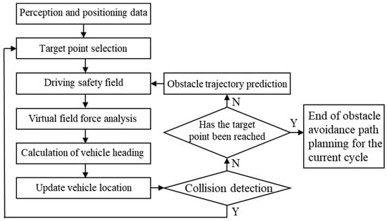 The initial path-planning process for dynamic obstacle avoidance, based on the driving safety field, is illustrated in Figure 2, corresponding to Step 1 in Figure 1. During the initiation of obstacle avoidance path planning, the vehicle’s driving behavior (e.g., lane changing, stopping, following, etc.) is determined based on perception and localization information. The target position area is selected based on the driving behavior, the motion states of the ego vehicle and surrounding vehicles in the target lane at the start of obstacle avoidance, and the road regulations. Typically, multiple points are selected within this area using equidistant intervals, and these points are usually located on the centerline of the target lane. In this paper, we adopt the method proposed in [29] to calculate the endpoint area for obstacle avoidance. The center point of this area is selected as the target position point for obstacle avoidance. Using the theory of the driving safety field, a comprehensive driving safety field model is established for obstacle avoidance scenarios by incorporating driving scene perception information and the target position. The virtual field forces acting on the ego vehicle within the comprehensive driving safety field are computed, and force analysis is performed. By considering both the magnitude and direction of the resultant force experienced by the ego vehicle in the comprehensive driving safety field, the vehicle’s target heading angle is calculated, considering the vehicle’s kinematic and dynamic constraints. If the difference between the target heading angle and the current heading angle exceeds the threshold determined by the steering system, the maximum steering angle of the vehicle is selected as the target steering angle for the next step. The next-step position is then updated accordingly, utilizing the principles of vehicle kinematics. At this point, collision detection is performed to ensure the safety of the planned avoidance path. If the collision constraint is satisfied, the next step is executed. If the collision constraint is not met, a new target position point is selected, and a new comprehensive driving safety field is constructed. The path-planning process is restarted from the current position of the ego vehicle. For example, if a sudden obstacle (such as a vehicle braking abruptly) appears on the planned path, then when calculating the next-step target heading angle for the ego vehicle based on the comprehensive driving risk field, it is determined that even with the maximum steering angle, the vehicle cannot avoid a collision with the sudden obstacle. In such a situation, the path planner needs to reassess and generate a feasible path to avoid multiple obstacles. If the difference between the target heading angle and the current heading angle is smaller than the predetermined threshold set by the steering system, collision detection is unnecessary. Instead, it is directly determined whether the vehicle has reached the target position. If the target position has not been reached, obstacle trajectory prediction is performed to update the comprehensive driving safety field model. Based on the updated safety field model, the aforementioned steps are repeated to further update the next-step position. Once the target position is reached, the obstacle avoidance path planning for the current cycle is completed.