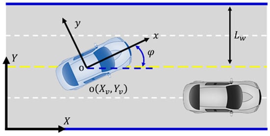 The vehicle body and global coordinate systems are defined in Figure 3. The vehicle body coordinate system (xoy) has its origin at the vehicle’s center of mass and follows the right-hand coordinate system convention. The X-axis is defined as the positive direction along the vehicle’s centerline, extending forward. The Y-axis is defined as the positive direction perpendicular to the vehicle’s centerline, pointing to the right. The global coordinate system (XOY) is defined with an arbitrary point before any vehicle’s movement in the driving scene as the origin. It also adheres to the right-hand coordinate system convention. The X-axis is defined as the positive direction along the road’s centerline in the direction of the vehicle’s motion. The Y-axis is defined as the positive direction perpendicular to the X-axis, pointing toward the left boundary of the road. The coordinate systems are measured in meters (m) unless otherwise specified.