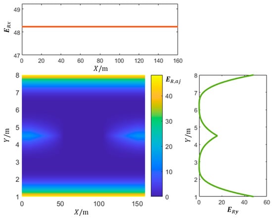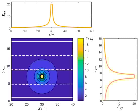 where represents the ego vehicle’s velocity, denotes the maximum speed limit on the current lane, and represents the acceleration due to gravity. corresponds to the current position of the ego vehicle along the vertical axis. represents the lane width, while , , and are undetermined positive constants. Figure 7 shows the distribution of the driving field strength generated by the target position.