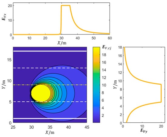 According to the theory of the driving safety field, the lane line belongs to the second category of stationary objects. The field strength, denoted as , of the potential field formed by lane line markings “a” at position is expressed as follows: