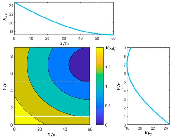 where the virtual mass of object “c” is denoted as , while signifies the road condition influence factor at . The distance vector from the center of mass of object “c” to the coordinates is defined as . The velocity vector of object “c” is represented by , and denotes the angle between and . Constants , , and are undetermined positive constants. Figure 6 shows the distribution of potential field strength generated by dynamic obstacles. It should be noted that the maximum constant values for and are not derived directly from Equation (5). The purpose of these figures is to provide a visual representation of the kinetic fields and their variation along the respective axes. The maximum constant values for and are determined based on the sizes and motion state of dynamic obstacles and the minimum safety distance between the ego vehicle and these obstacles. These values are chosen to ensure a suitable range of kinetic field strength values that effectively guide the path-planning process while considering driving safety and obstacle avoidance.