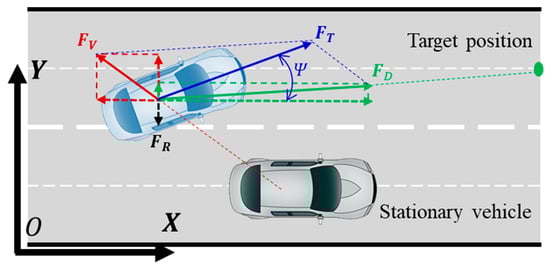In the path-planning process, the vehicle is simplified as a particle, and the motion state of the vehicle during the planning process is described using parameters such as the position of the vehicle’s center of mass, velocity vector, and heading angle. If we disregard the influence of the lateral deviation angle of the center of mass, the velocity direction and heading angle of the vehicle’s center of mass remain consistent. Figure 8 illustrates a force diagram at the vehicle’s center of mass during the obstacle avoidance path-planning process. represents the force exerted on the vehicle by the potential field formed by a stationary obstacle vehicle in the original lane. The force direction follows the line connecting the centers of the two vehicles and moves away from the obstacle vehicle, indicating a repulsive force. represents the force exerted on the vehicle by the potential field formed by the lane lines of the target lane. The force direction is perpendicular to the lane lines, constraining the vehicle to travel along the road’s centerline, and also acting as a repulsive force. represents the force exerted on the vehicle by the kinetic field formed by the target position in the lane-changing obstacle avoidance process. The force direction follows the line connecting the vehicle’s center of mass and the target position, pointing toward the target position and acting as an attractive force, driving the vehicle toward the target position. The resultant force of the three types of driving safety field forces is denoted as , and the angle between and the road’s centerline is the vehicle’s heading angle, . As the vehicle’s motion state changes, the direction of the resultant force at the center of mass also changes, and the vehicle moves toward the target position under the driving force of the combined driving safety field, ultimately completing the obstacle avoidance path-planning process. The calculation formula for the driving safety field at the vehicle’s center of mass is as follows: