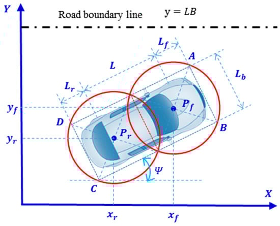 Two circles with the same radius are used to cover the minimum outer rectangle of the vehicle contour uniformly to realize the approximate description of the vehicle shape in [3], as shown in Figure 9. In the figure, the rectangle ABCD is the minimum outer rectangle of the vehicle contour, the points and are the centers of the two circles that uniformly cover the vehicle contour, and is the radius of the circle that uniformly covers the vehicle contour. According to the geometric relationship, the coordinates of the center of the circle and the radius are calculated as follows: