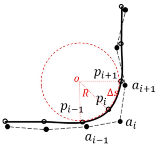 Firstly, considering the vehicle steering system constraints, the vehicle driving along the smoothed path points should satisfy the constraint of the minimum turning radius , assuming that three consecutive path points form a circle, as shown by the red dashed circle in Figure 10. Based on the principle of similar triangles, the turning radius corresponding to the current path point can be determined. Therefore, the turning radius at the current path point must satisfy the following constraint: