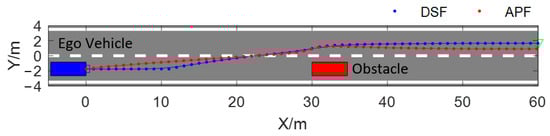 Figure 11 shows the obstacle avoidance paths planned based on the DSF and the improved APF presented in [32]. The blue dotted line is the path planned based on the proposed method and the red dotted line is the path planned based on the improved APF. From Figure 11, it can be seen that the obstacle avoidance path planned based on the APF starts changing lanes earlier than the DSF, and the process of the obstacle avoidance path planned based on the APF is longer. Compared with the DSF, the test vehicle spends a longer time in a state of crossing two lanes, which increases the risk of collision. The path planned with the DSF is safer than the APF in this regard.