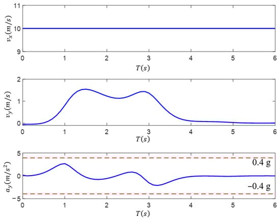 Assuming that the lane-changing obstacle avoidance process of the vehicle corresponds to steady-state steering and the lateral deviation angle of the vehicle’s center of mass is minimal, we can approximate the center of mass velocity as the velocity component of the vehicle along the X-axis under constant speed conditions. Consequently, we can determine the lateral acceleration as follows:
