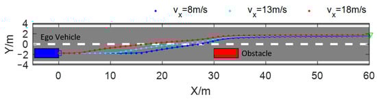 The driving safety field constructed based on field theory has the characteristics of a vector field in physics, and the force that the test vehicle receives in the driving safety field is not only related to the field strength formed by the traffic elements but is also related to the motion state of the test vehicle. Whether the traditional or improved artificial potential field is used for obstacle avoidance path planning, the motion state of the test vehicle is not taken into account; therefore, faced with the scenario shown in Figure 11, regardless of the value of the auto-vehicle velocity taken, the trajectory planned with the APF is consistent with the red dotted line in Figure 11, and the planned path will not be able to adapt to the changes in the velocity of the test vehicle. Since the test vehicle is subjected to the field force in the driving safety field considering the test vehicle’s motion state, the problem can be effectively solved by planning the path using the method proposed in this paper. As shown in Figure 14, when the test vehicle passes through the same scenario shown in Figure 11 with different constant velocities, the obstacle avoidance path planned using the method proposed in this paper varies with the velocity of the test vehicle, and when the velocity of the vehicle is greater, the vehicle starts to change lanes at an earlier moment, i.e., farther away from the static obstacle, which allows enough longitudinal space to be reserved for lane changing. From the figure, it can be seen that when the vehicle velocity vx = 10 m/s, the test vehicle starts to perform lane-changing obstacle avoidance at the position of x = 10 m, and when vx = 18 m/s, the test vehicle starts to perform lane-changing obstacle avoidance at the position of x = 1 m. In order to illustrate the problem more clearly, Table 3 shows the positions of the two methods of planning obstacle avoidance paths across the target lane line for three different vehicle velocities. The position of the APF-planned path across the lane line is independent of the velocity of the ego vehicle, which is kept at x = 23.98. The method proposed in this paper has the ability to adapt to the state of the movement of the ego vehicle; with the rise in the velocity of the vehicle, the position of the vehicle across the lane line will be farther away from the obstacle vehicle, which can guarantee the safety of the vehicle obstacle avoidance process.
