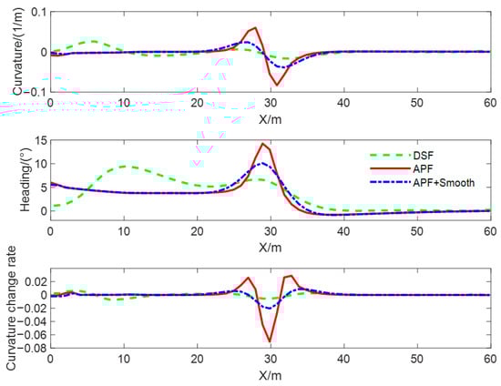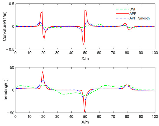 The curves of the curvature and heading angle of the obstacle avoidance path generated using three methods in multiple obstacle scenarios are shown in Figure 18. From this figure, it can be seen that the maximum curvature of the obstacle avoidance path generated with the improved APF is close to 0.5 , and the maximum heading angle is close to 50°. After smoothing, the curvature becomes smoother and continuous, and the maximum heading angle decreases by more than 50%. This verifies that the proposed smoothing method is suitable for smoothing discrete obstacle avoidance waypoints. In contrast, the obstacle avoidance path generated with the DSF is smooth and continuous, with small changes in curvature and heading angle. This verifies that the obstacle avoidance path generated using the proposed method in multiple obstacle scenes has higher quality and can reduce the difficulty of trajectory tracking control.