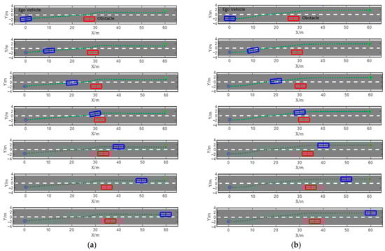 Test scenario 2 is a two-lane scenario with low-velocity obstacles; the test vehicle is driving at 10 m/s, and the low-velocity obstacle is located in the lane where the test vehicle is driving at 1.5 m/s. In order to improve driving efficiency, it is required that the test vehicle is able to complete the obstacle avoidance process by lane changing in a safe and smooth manner. The simulation results are shown in Figure 15 and Figure 16, which present the lane-changing and obstacle avoidance processes of the test vehicle tracking the planning path generated with the APF and the DSF, respectively. In Figure 16, the blue origin is the planning starting point, the green triangle is the planning endpoint, the blue box represents the test vehicle, the green box represents the low-velocity moving obstacle, and the green solid line represents the planned path, and the figure shows the relative positions of the test vehicle and the obstacle vehicle when it drives along the planned path with the velocity of 10 m/s to the position of in order from the top to the bottom. Comparing Figure 16a,b, it can be seen that at , the heading angle of the test vehicle at the beginning of the path based on the APF is non-zero, and the test vehicle starts to perform lane changing; the heading angle at the beginning of the path based on the DSF is 0, and the test vehicle drives along the centerline of the current lane. At the position of in the course of the lane-changing and avoidance process, the test vehicle driving along the planning path based on the DSF has already finished driving into the target lane, which decreases the possibility of collision with the obstacle vehicle, while the test vehicle driving along the planning path based on the APF is still in the position of crossing the two lanes, which increases the possibility of collision with the obstacle vehicle. At the end of the planning path, the planning path based on the DSF can realize the vehicle driving along the centerline of the target lane, while the planning path based on the APF has a certain deviation from the centerline of the target lane, which leads to the test vehicle possibly driving on the pressure of the lane line, which is not in line with the requirements of the traffic regulations and increases the driving risks. Comprehensive analysis shows that using the obstacle avoidance path-planning method proposed in this paper, the test vehicle can quickly complete the lane-changing process and ensure that driving is maintained along the centerline of the road at the planning starting point and the endpoint of the path. Due to the construction of the DSF-integrated consideration of the test vehicle, the lane line, and the impact of other traffic participants, compared with the APF, it can significantly improve driving safety.